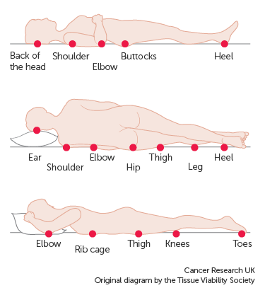 e) Use pillows between the legs. Do not allow two bony prominences to meet together.