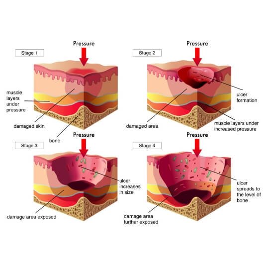 Bed sores also called pressure sores or pressure ulcers are injuries to skin and underlying tissue resulting from prolonged pressure on the skin. Bedsores most often develop on skin that covers bony areas of the body, such as the heels, ankles, hips and tailbone.