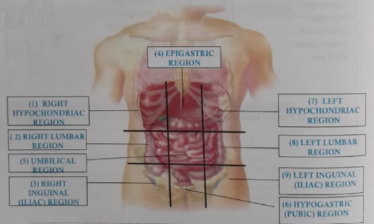 Three horizontal lines and two vertical lines create nine regions of the abdomen. Below is an image of the regions of the abdomen, which are formed within these planes. “Hypo” refers to “below”, “epi” refers to “above”, “chond” refers to the cartilage of the rib and “gast” is in reference to the stomach.