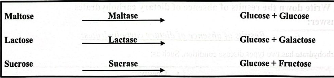 4. Glycogen is also broken by these enzymes to dissacharides. Enzymes maltase, sucrase and lactase present in the brush borders of the columnar cells of small intestine convert dissacharides to monosaccharides.