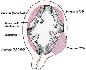 1. Placenta Accreta – abnormal adherence, with absence of decidua basalis. The incidence of placenta accreta also significantly increases in women with previous cesarean section compared to those without a prior surgical delivery.