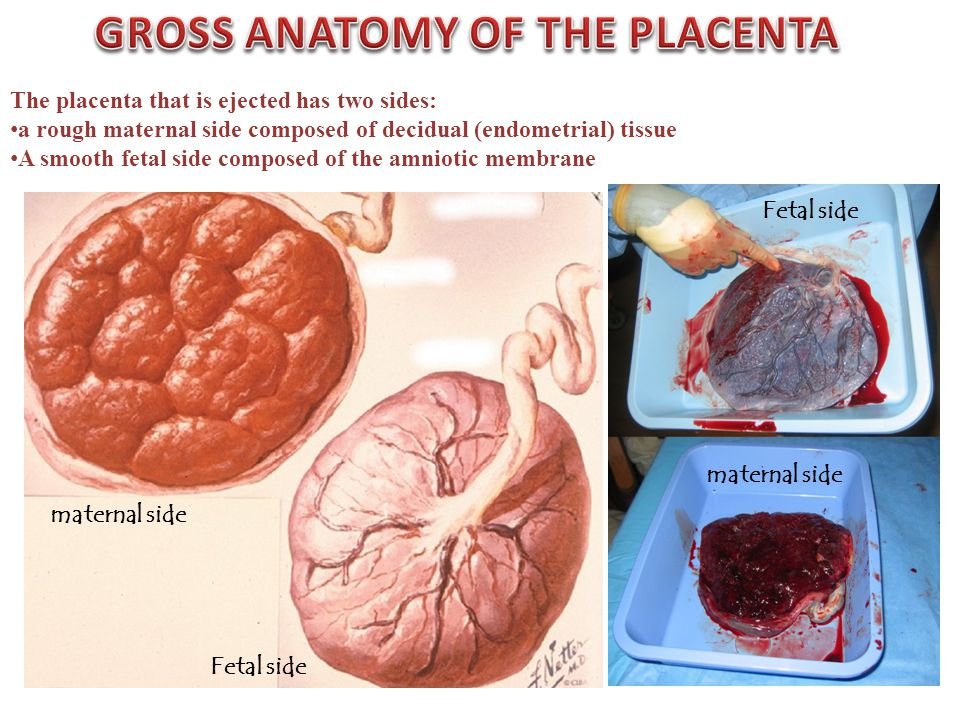 - The maternal surface of the placenta is arranged in about 20 lobes; each lobe is made up of lobules, each with a single chorionic villus and its branches. The maternal side is red and ‘meaty’ rich with maternal blood and decidua