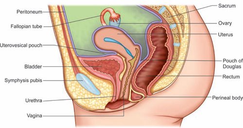 Figure: Mid-sagittal section of the female pelvis showing relative position of the pelvic organs.