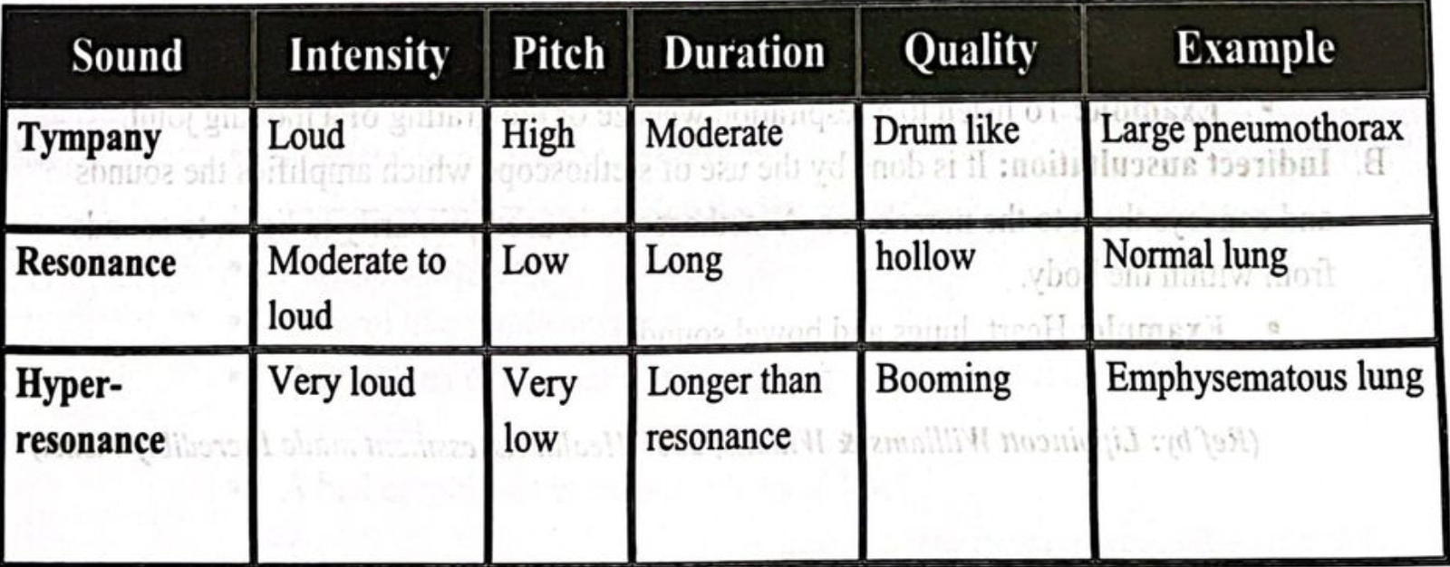 Percussion is a method by which the body is struck indirectly to elicit sounds. Sounds produced: flatness (bone); dullness (liver); resonance (lungs); hyper resonance (emphysema/lung); tympani (abdomen). May be performed directly or indirectly.