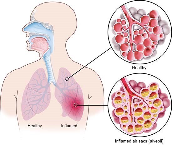 Pneumonia is an infection that inflames the air sacs in one or both lungs. The air sacs may fill with fluid or pus (purulent material), causing cough with phlegm or pus, fever, chills, and difficulty breathing.