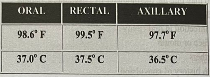 Axillary temperature is 0.5 °C less than oral temp.