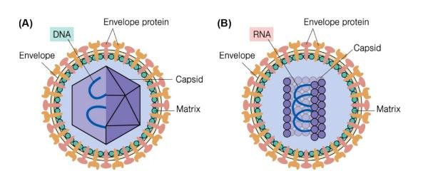 Viruses are particles composed of an internal core containing either DNA or RNA (but not both) covered by a protective protein coat.