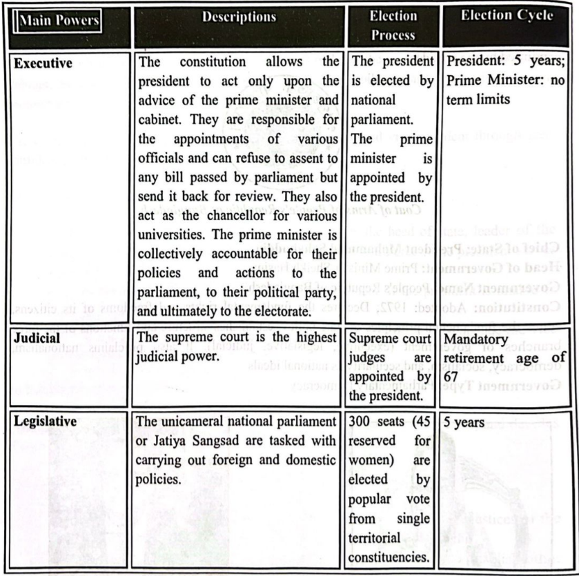 Constitution: Adopted: 1972; Declares the fundamental rights and freedoms of its citizens, states the fundamental principles of state policy, establishes structure and functions of the three branches of government (executive, legislative, judicial). It also proclaims nationalism, democracy, socialism, and secularity as national ideals