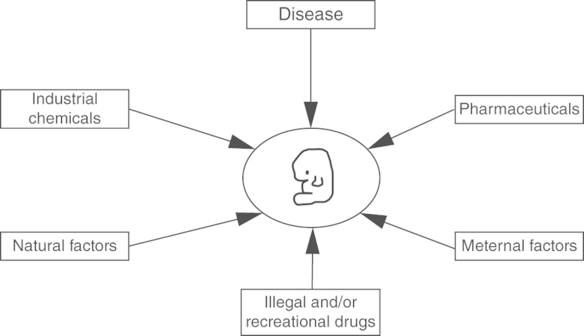 Exposure to certain drugs, chemicals, or infectious agents during pregnancy can disrupt embryonic development and cause teratogenic effects. Examples include fetal alcohol syndrome and the effects of thalidomide exposure.