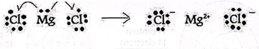 In this example, the magnesium atom is donating both of its valence electrons to chlorine atoms. Each chlorine atom can only accept 1 electron before it can achieve its noble gas configuration; therefore, 2 atoms of chlorine are required to accept the 2 electrons donated by the magnesium. Notice that the net charge of the compound is 0.