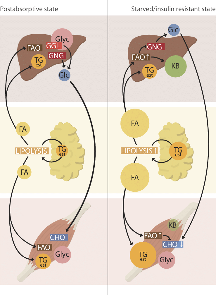 As the starvation state progresses, the liver increases ketone body production, providing an essential energy source for the brain and other tissues.